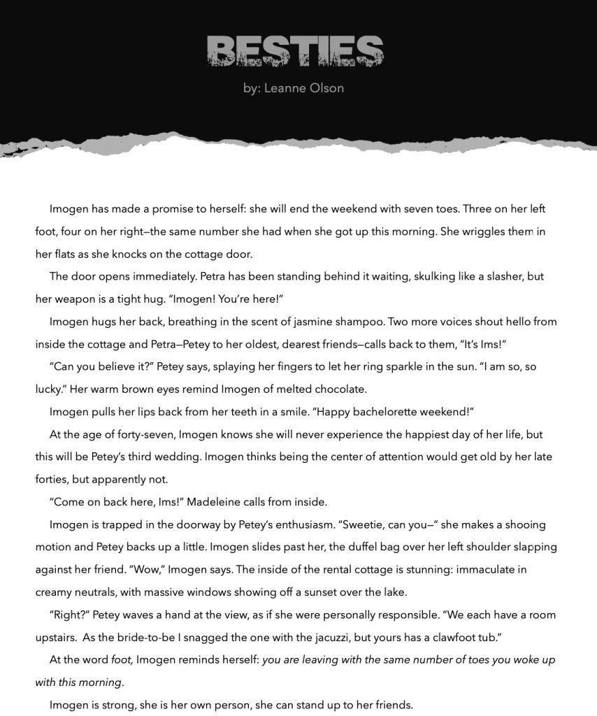 My story “Besties” is about five friends getting together for a Bachelorette Weekend that involves a bit of sacrifice. You can read it free online, and here’s a peek below: